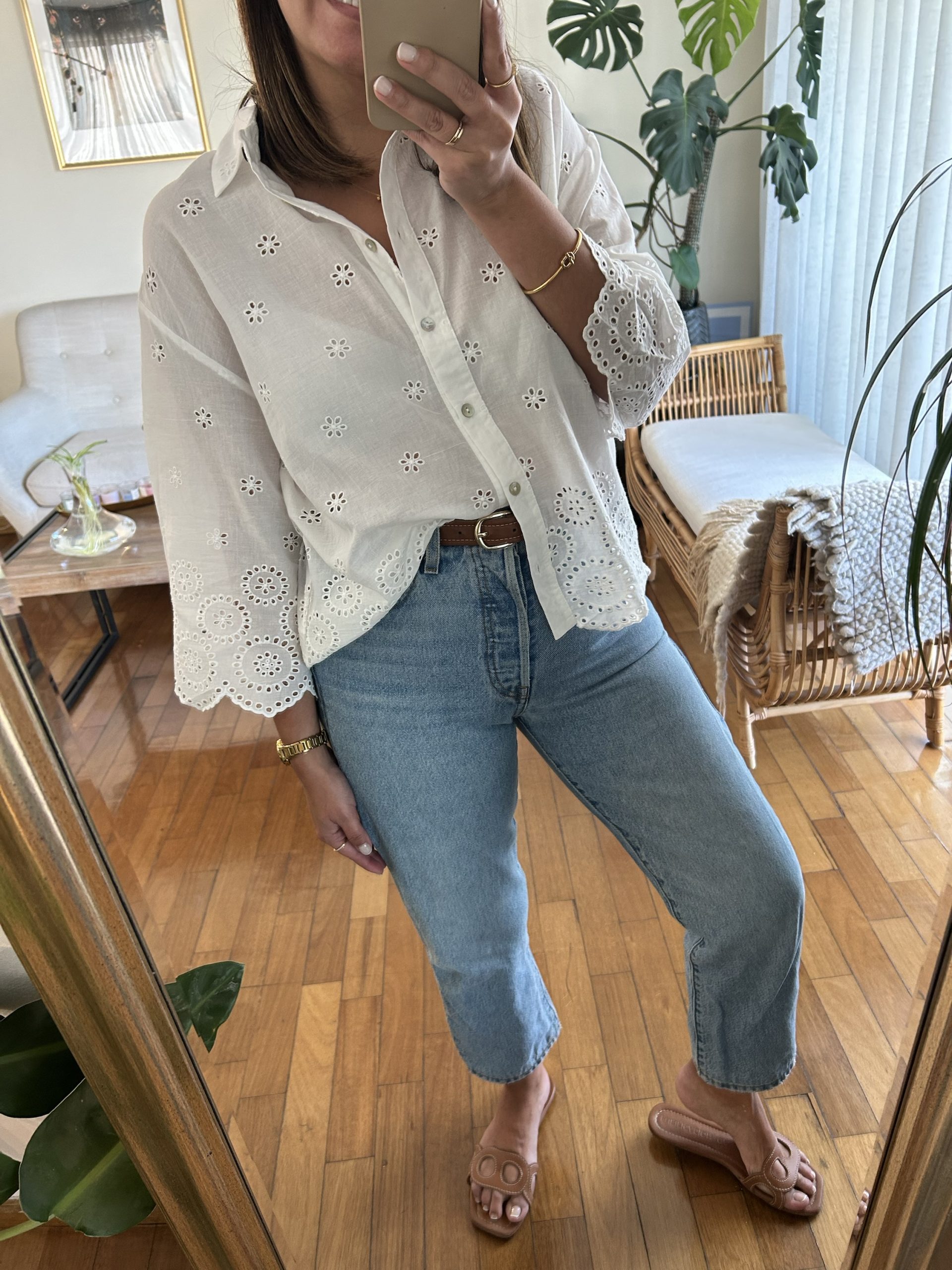 Blusa de manga 3/4, confeccionada en tela 100% algodón con aplicaciones en Broderie.